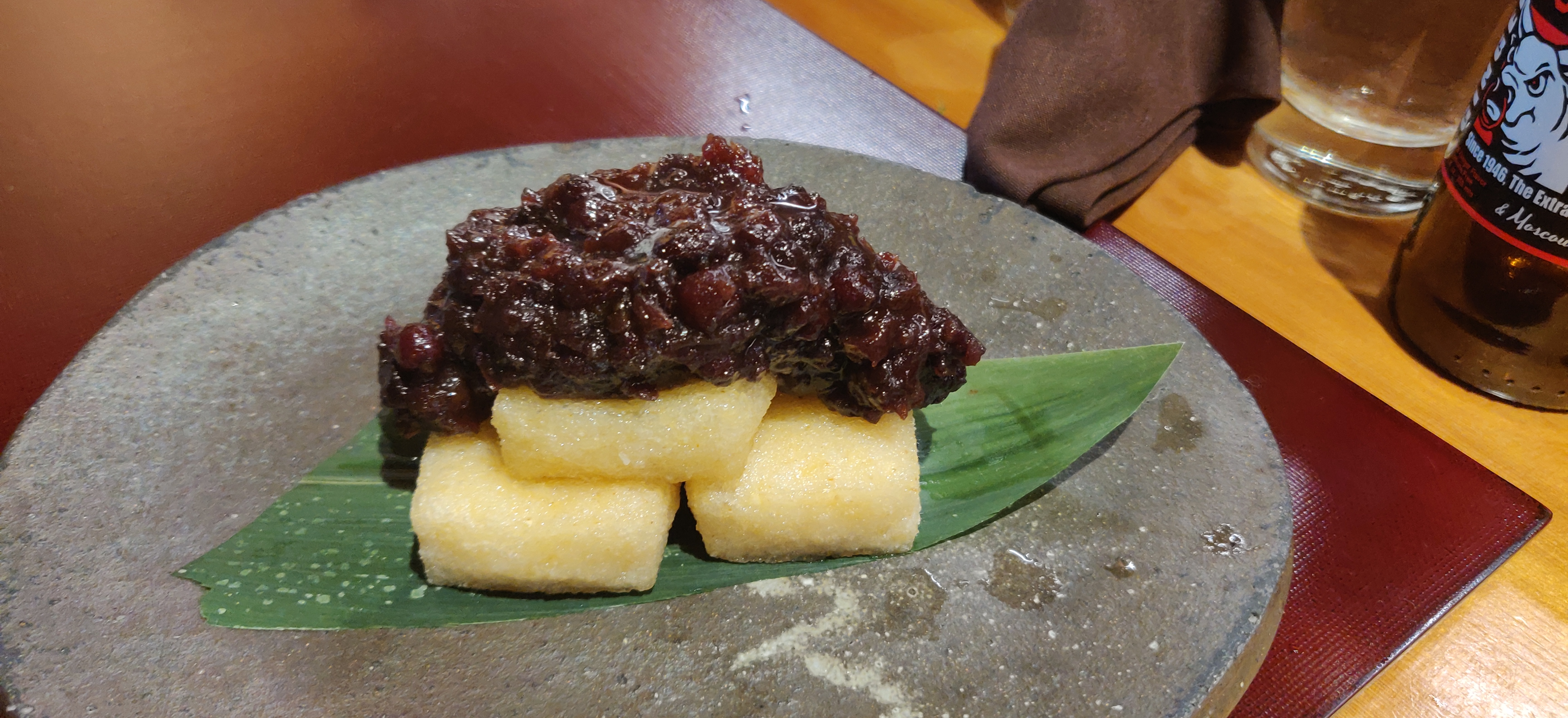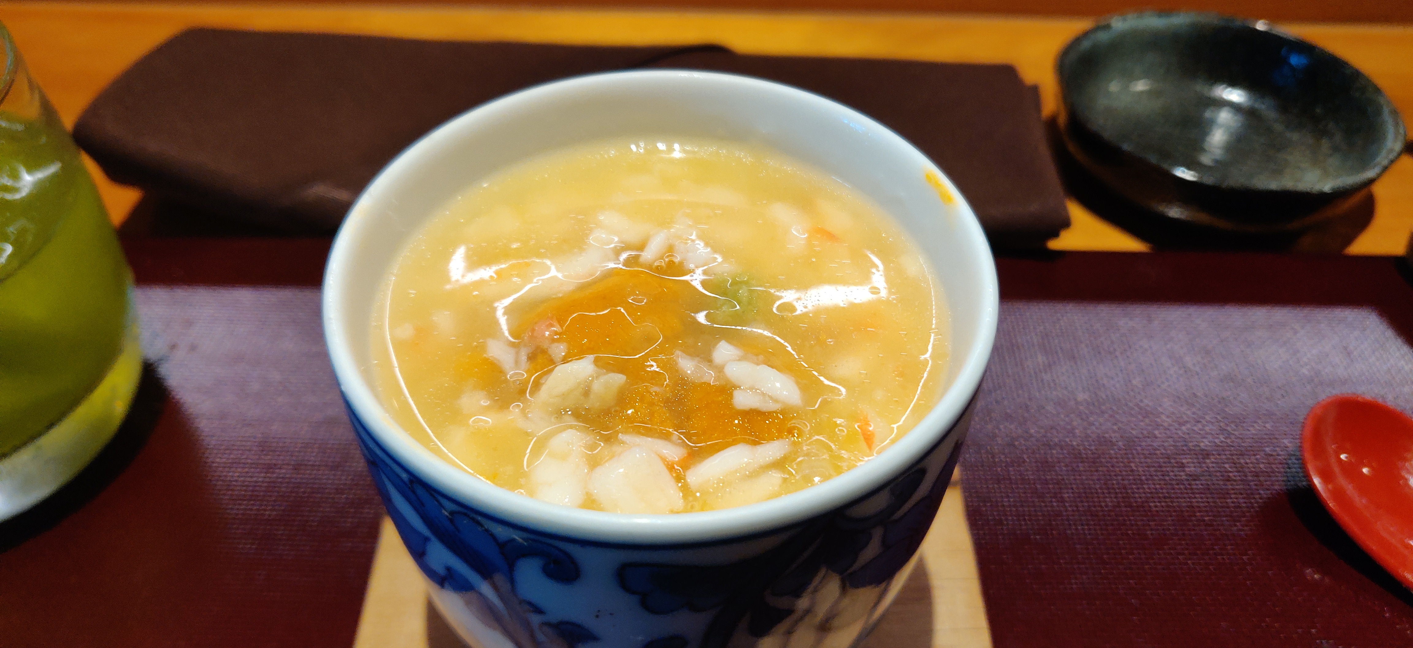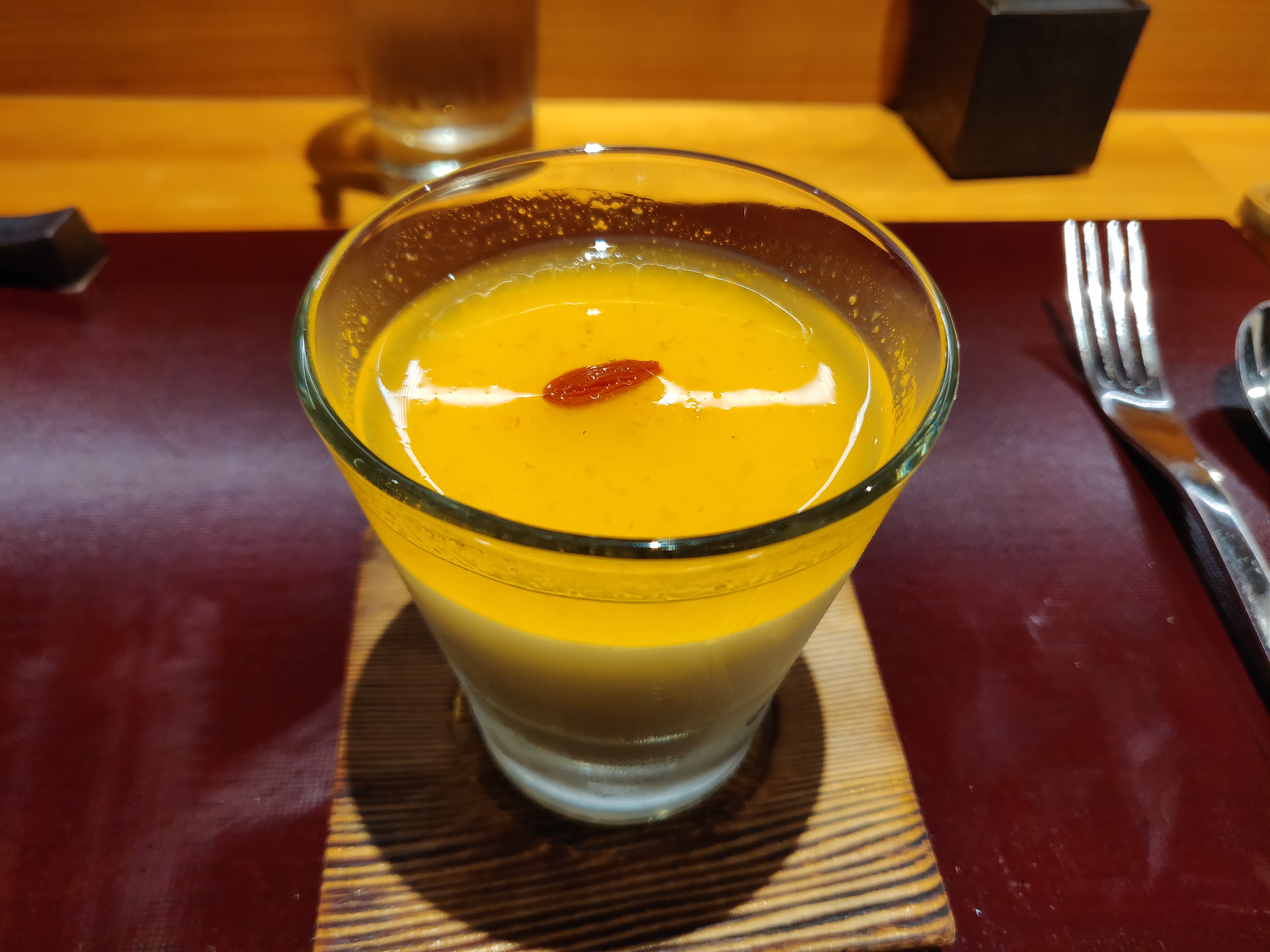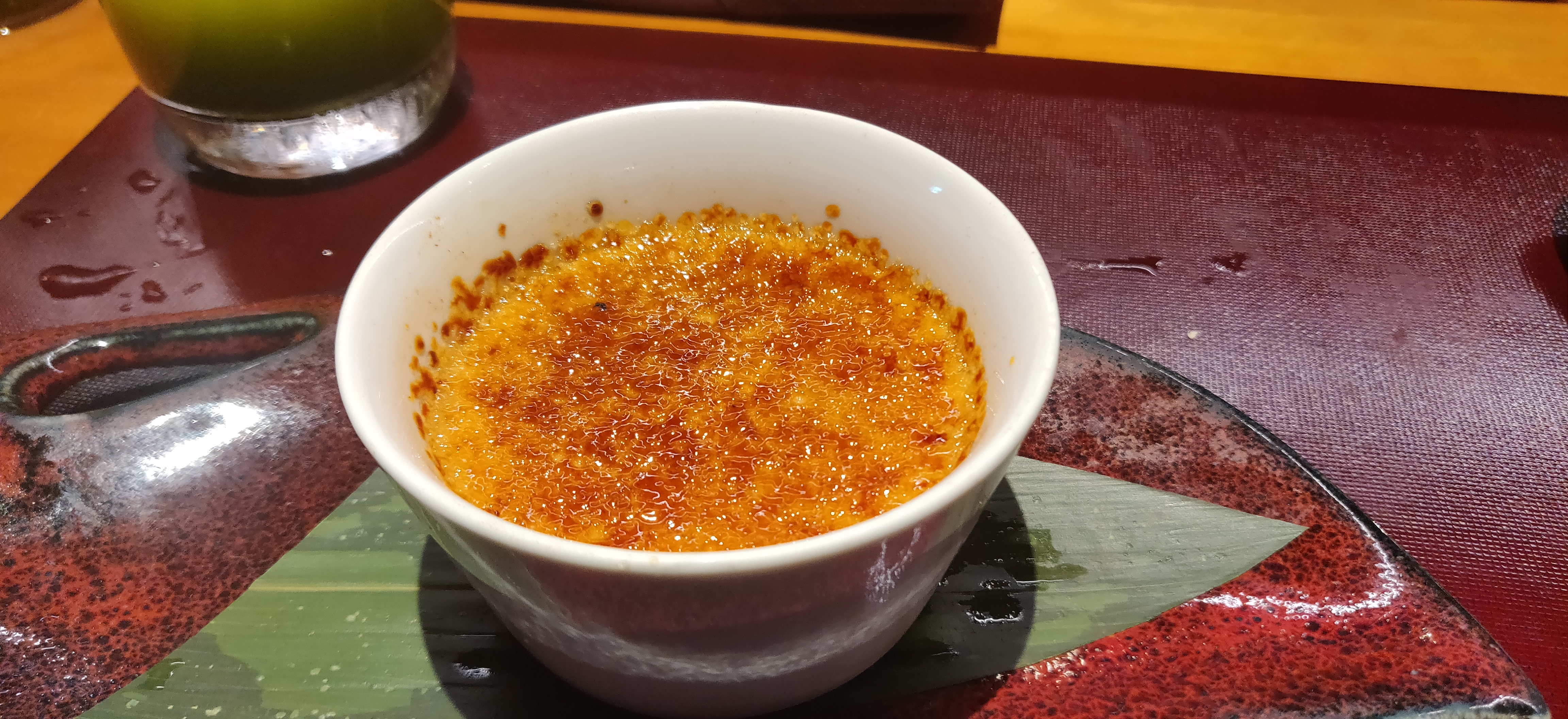 For dessert, they usually only have three choices that I know of: a yuzu panna cotta, a house made mochi with red beans; which is my brother’s go-to, and a chestnut creme brulee; which, incidentally, is my go-to. If you like something that is warm, chewy and has a crispy layer while not being to sweet, go for the mochi. If you like a nutty taste with a mixture of butterscotch (because it has that), you might enjoy the creme brulee. For the panna cotta, which we didn’t order, but I’ll post a picture of it anyways, it has a citrus taste, because it has yuzu sauce, couples with a creamy yogurt base.