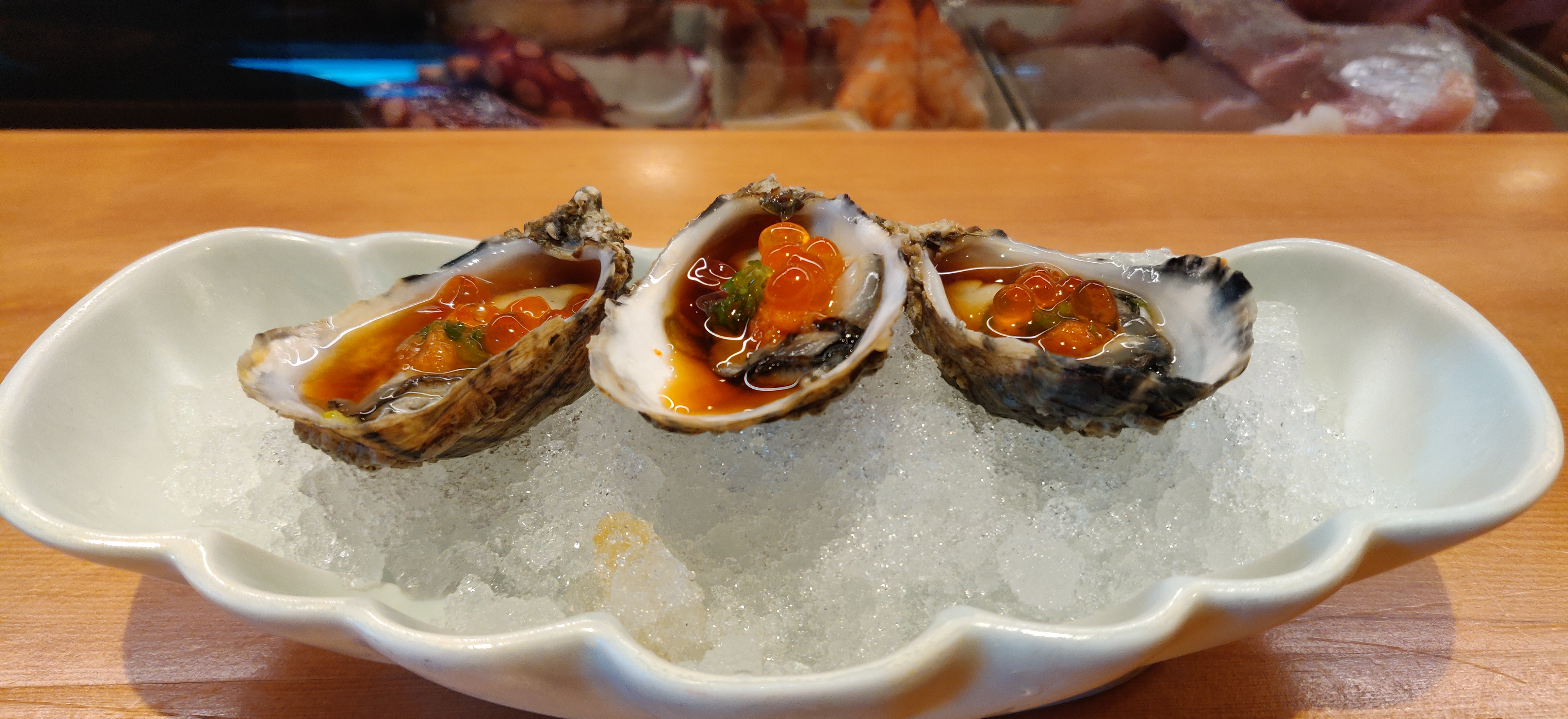 So we’re going to talk about the chef’s Omakase. So Tamura’s Omakase comes first with a set of hot dishes, about 4 dishes, and then ends with 7 courses of sushi. At Tamura, they always start their courses with 3 oysters with ponzu sauce and garnished with fish eggs. Since I usually swallow oysters in one gulp, all I can tell you about this is that the sourness of the ponzu sauce can somewhat mask the brininess of the oyster. Another thing they always bring out is there chawanmushi, or steamed egg custard. What’s special about this one is in addition to eggs, they also put black cod, a bit of Hokkaido uni, and king crab in it while garnishing it with a touch of wasabi. Looking at it, it doesn’t look all that impressive; in fact, it looks very watery (chawanmushi is usually stiff on top). Underneath the watery exterior, is a firm, custard interior, with bits of fish in it. Quite honestly, I could do without the cod and the uni, despite being delicious, is feels slightly out of place in an egg dish. The king crab, however, goes perfectly with the eggs.