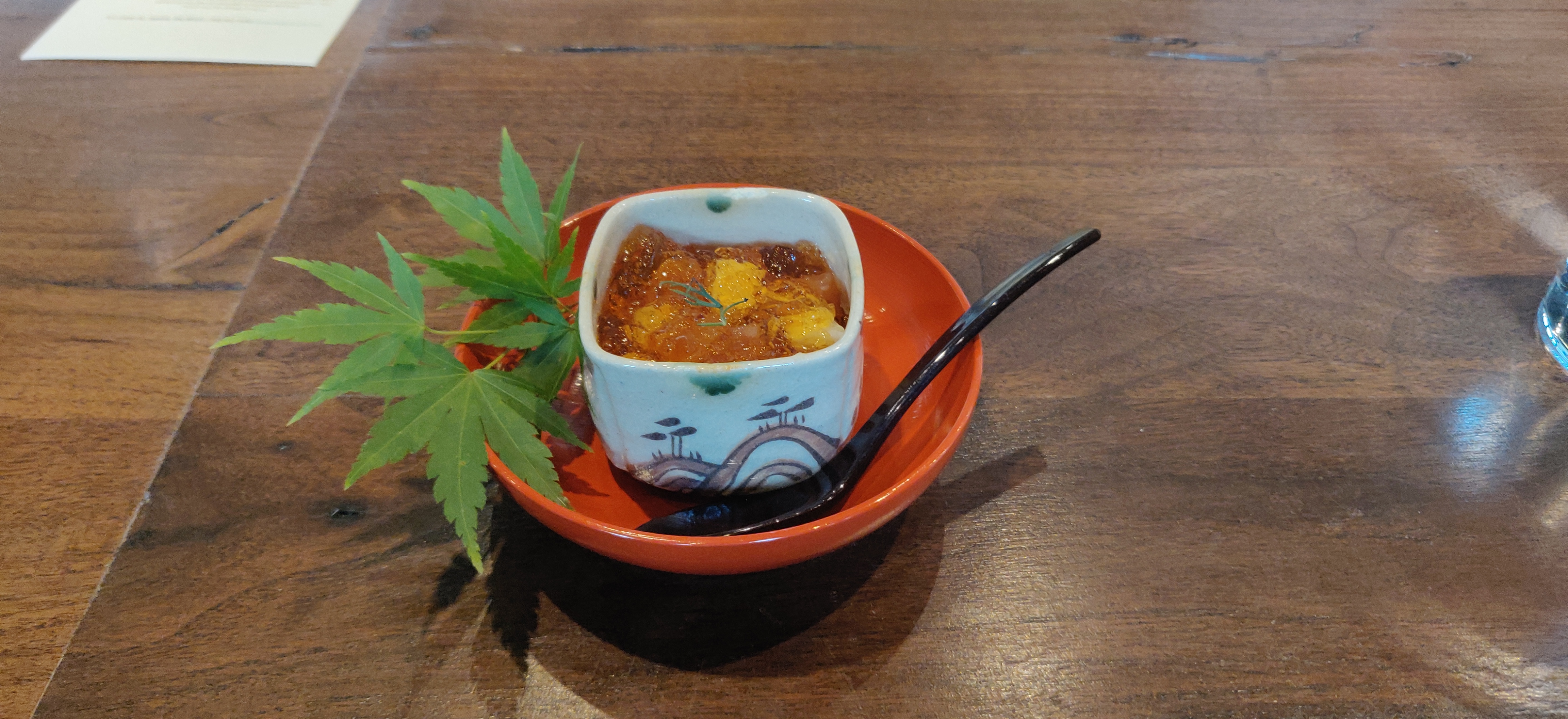 Anyways, when we arrive, they were serving things on there July menu; which in it of itself is interesting because it’s not July anymore. In other words, by the time you read this and decide to go, you most likely will have something different than I did. They give you a standard hot towel to clean your hands and let you sit and relax as they prepare the first course. The first course is a salmon tartare, which to me is less tartare and more cubed salmon (like poke) and mixed with something called mountain yam, which is like this hard white kind of thing, and topped with this jelly thing. It tastes fine, fresh fish taste and the jelly had a hint of yuzu; the thing is, the soft texture of the salmon and the toughness of the yam contrasts with each other greatly.