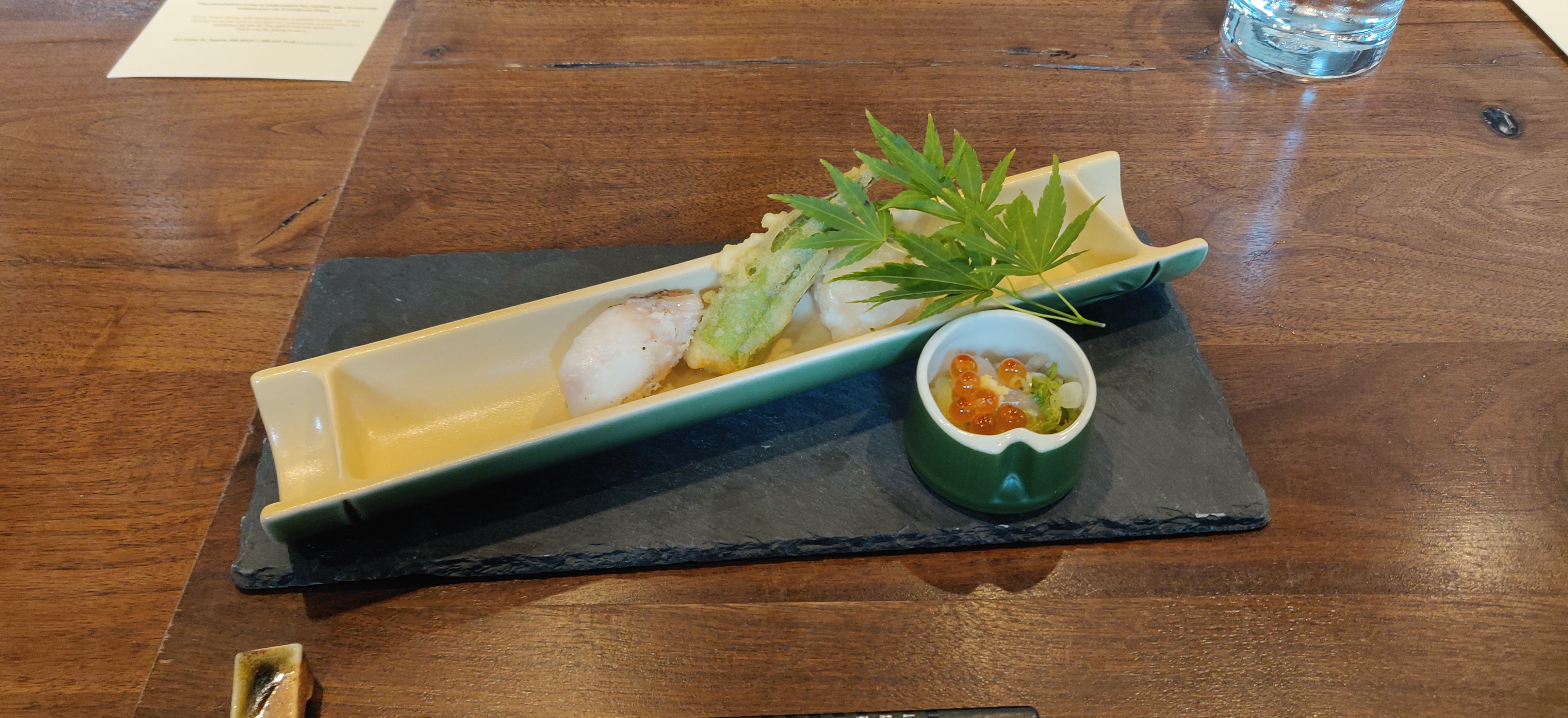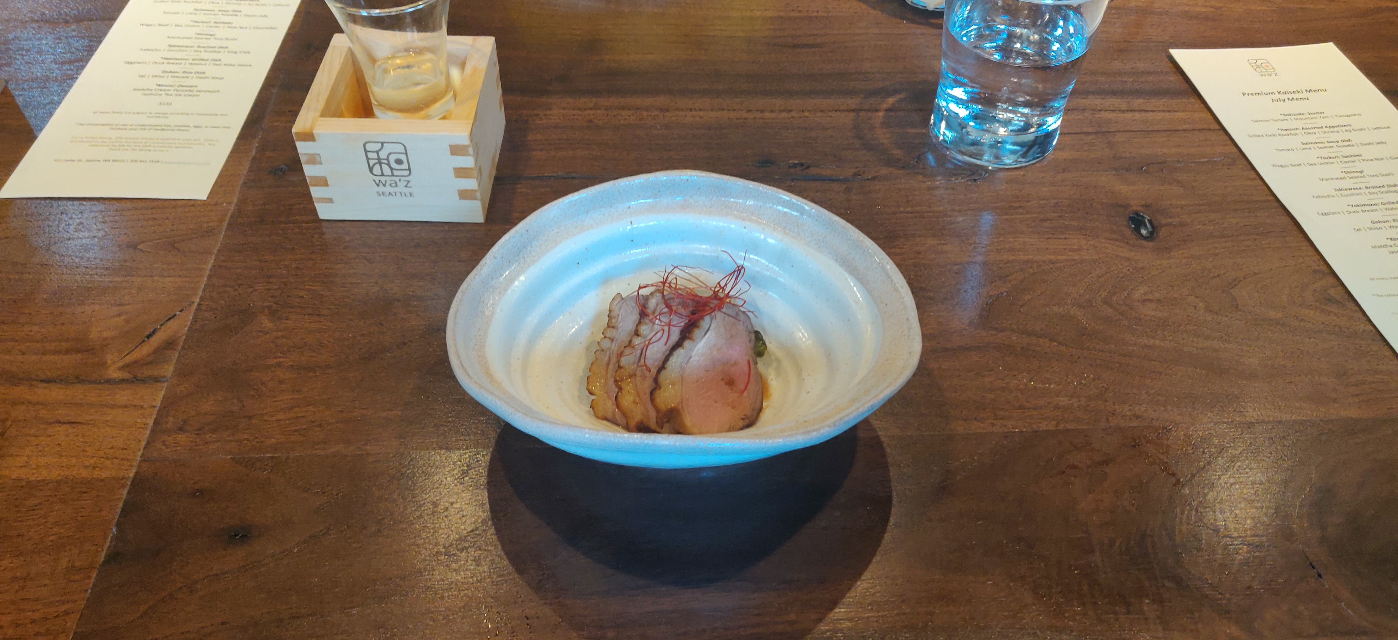 That said, today I decided to follow another tip from the people I follow on Instagram and go to a place called Wa’z, which I still have no idea how you’re supposed to pronounce that (I think it is like the word “was” but a bit longer). They are located on Cedar Street in downtown Seattle; practically hugging the Space Needle. Their menus are a standard 10 course tasting menu situation, a kaiseki if you will, $110 per person as well as numerous sake choices. When you call to reserve, which I recommend, you are given the choice of table or counter. If you are ever at a Japanese restaurant and they give you the choice to sit at the sushi bar, always go for it.