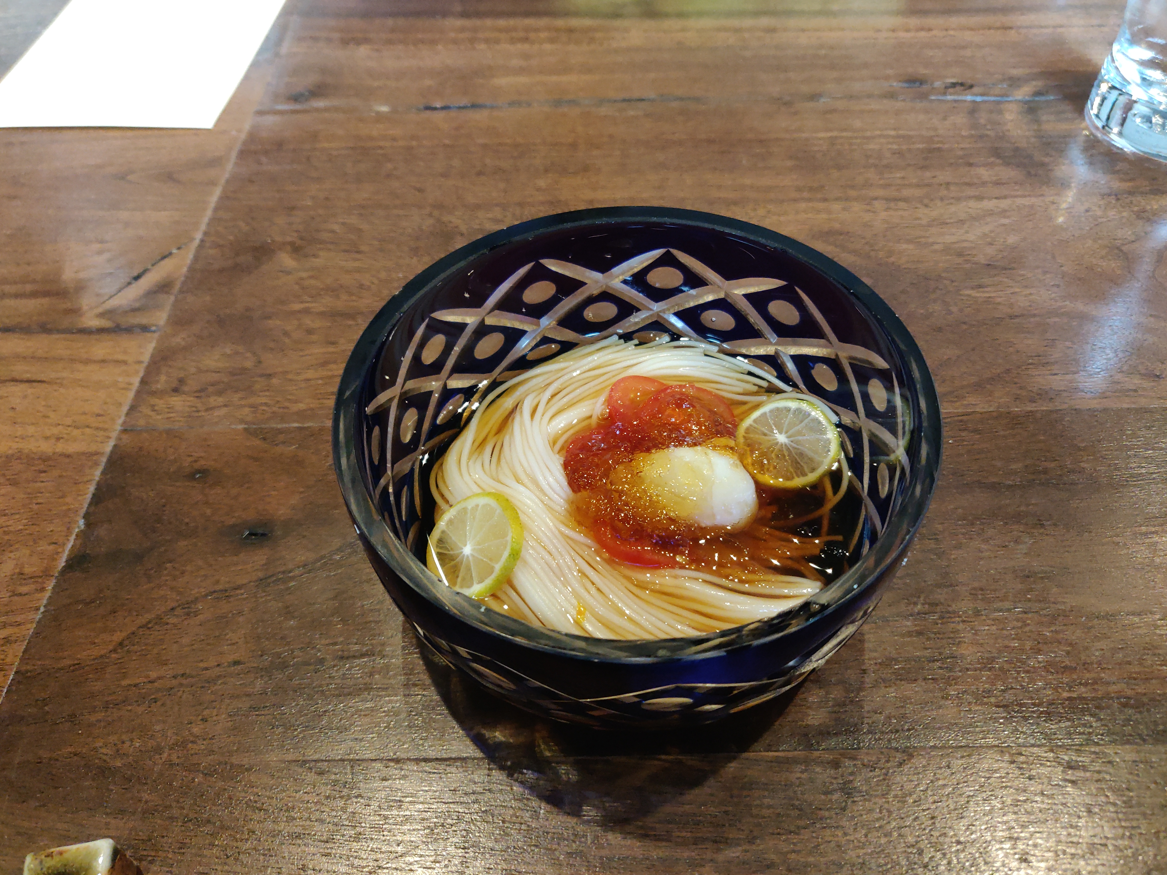 Next course, according to the menu, is a soup course; and what the serve up is….noodles. To be fair, the noodles were in the soup, and quite honestly, it did add an extra kick to it. The soup was very light and had small slices of tomatoes and lime it. It was a chilled noodle soup, so it was perfect for the blazing Summer heat outside. Afterwards, is the sashimi course, which also had some confusion. Instead of fish, they served us….beef, but it was Wagyu beef. The Wagyu beef was garnished with uni, or sea urchins, and a bit of caviar. They told us, before eating, to mix the uni in with the beef; I know, weird right? The beef was really soft, not the melt in your mouth kind mind you, but almost there. Mixing the uni didn’t really add anything to the beef, that or I didn’t mix it well enough. Either way, I felt like this dish could have been eaten without mixing.