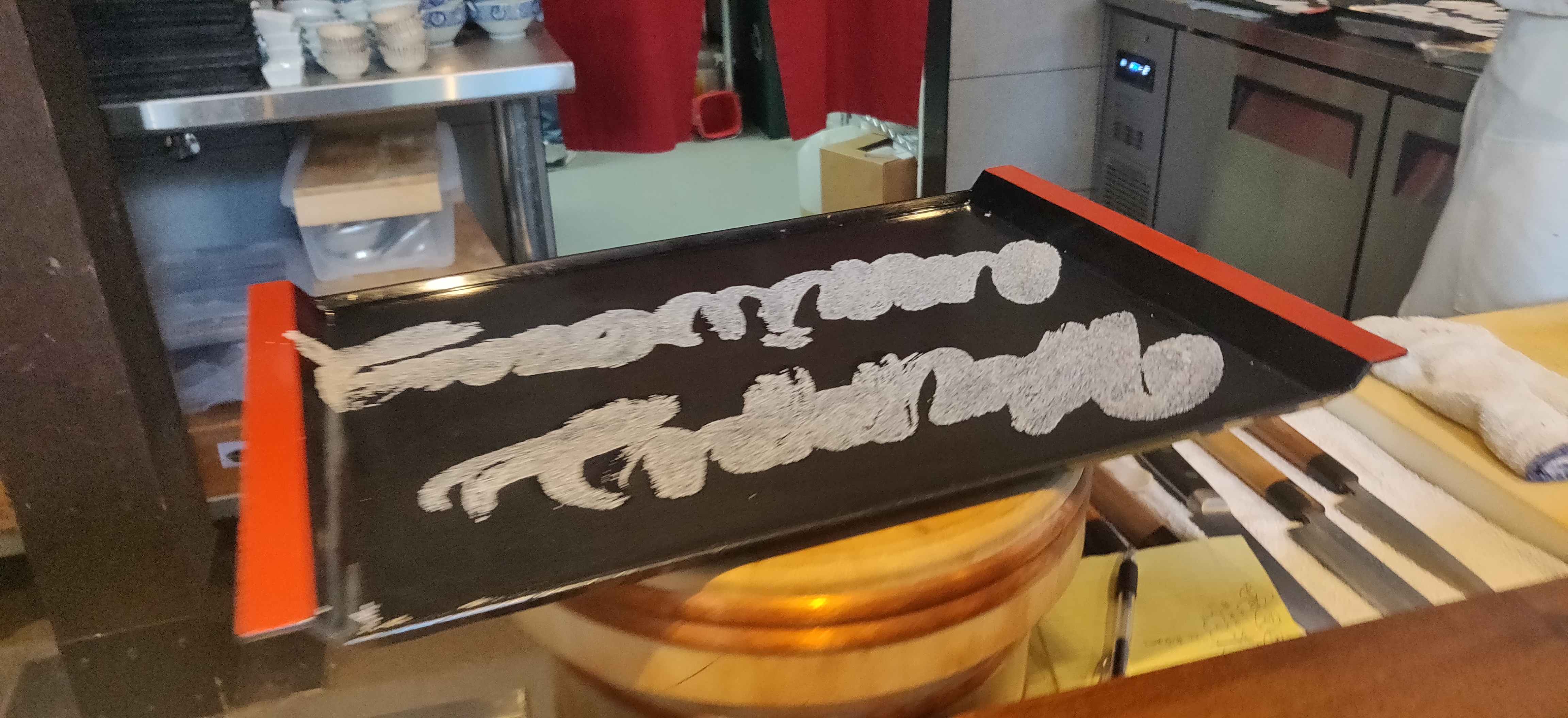 Also, this is slightly irrelevant to the dinner, but if you are celebrating something, they will take a tray, paint a message (like happy birthday) with some kind of glue, and pour a metric ton of salt on the tray, leaving a white, salty message on the tray and serving your dessert on it.