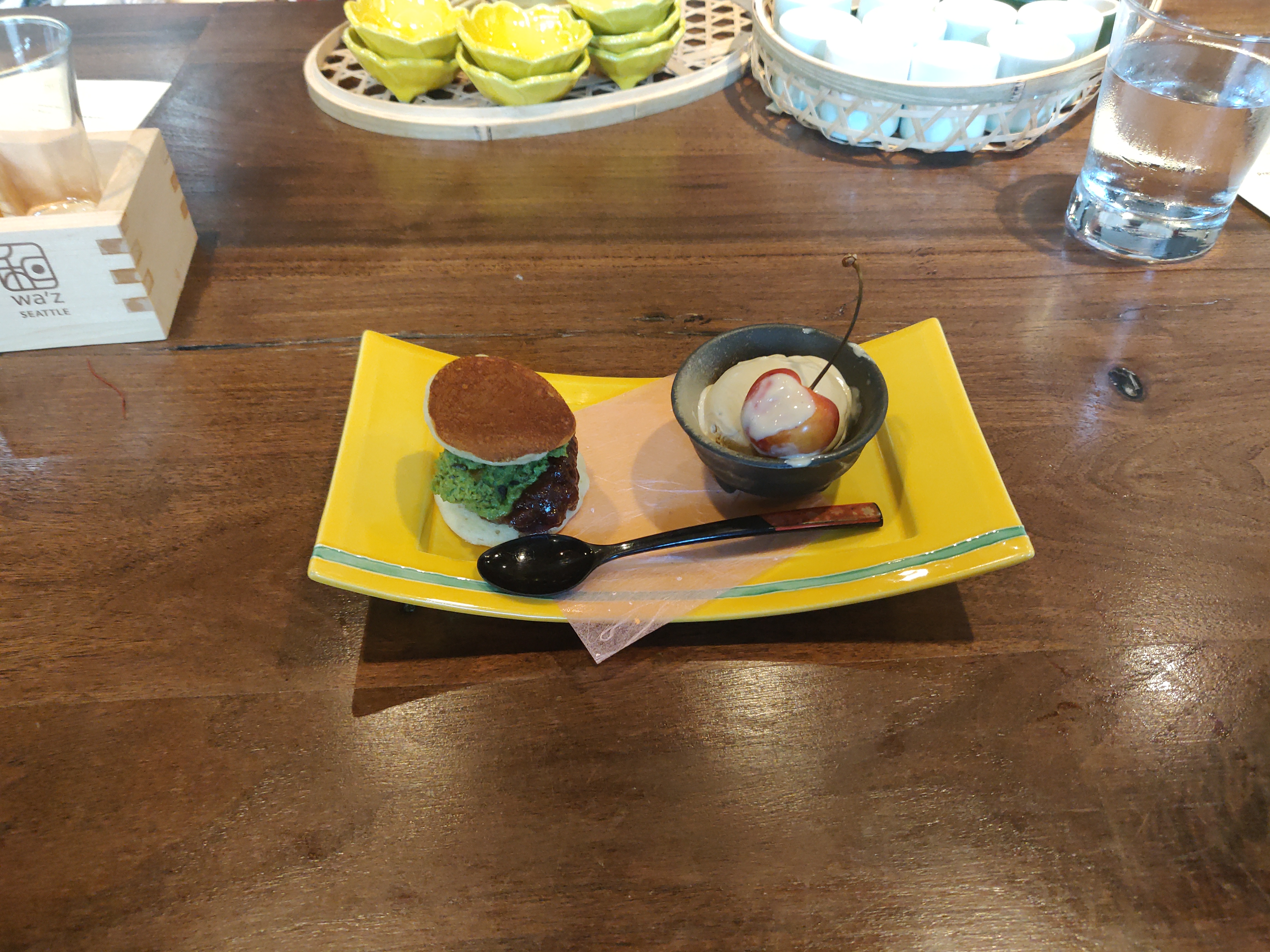 Finally is dessert. Dessert is there twist of a dorayaki, or two pancakes stacked together with red beans in the middle. They added a matcha cream as well, so when eaten with the red beans and the two fluffy pancakes, it yields a light sweet taste, as neither of those things are meant to have strong flavors. In addition to the dorayaki, there is a bowl of jasmine tea ice cream topped with a cherry; but not just any cherry, an actual Rainier cherry. Now, I’m allergic to cherries (I know, shocking right) so I didn’t eat the Rainier cherry; although, it is a cherry, what more do you want to know. The ice cream had a really strong and really creamy tea flavor. It is as if I was consuming a thick milk tea, which I am still deciding whether or not that is a good thing.